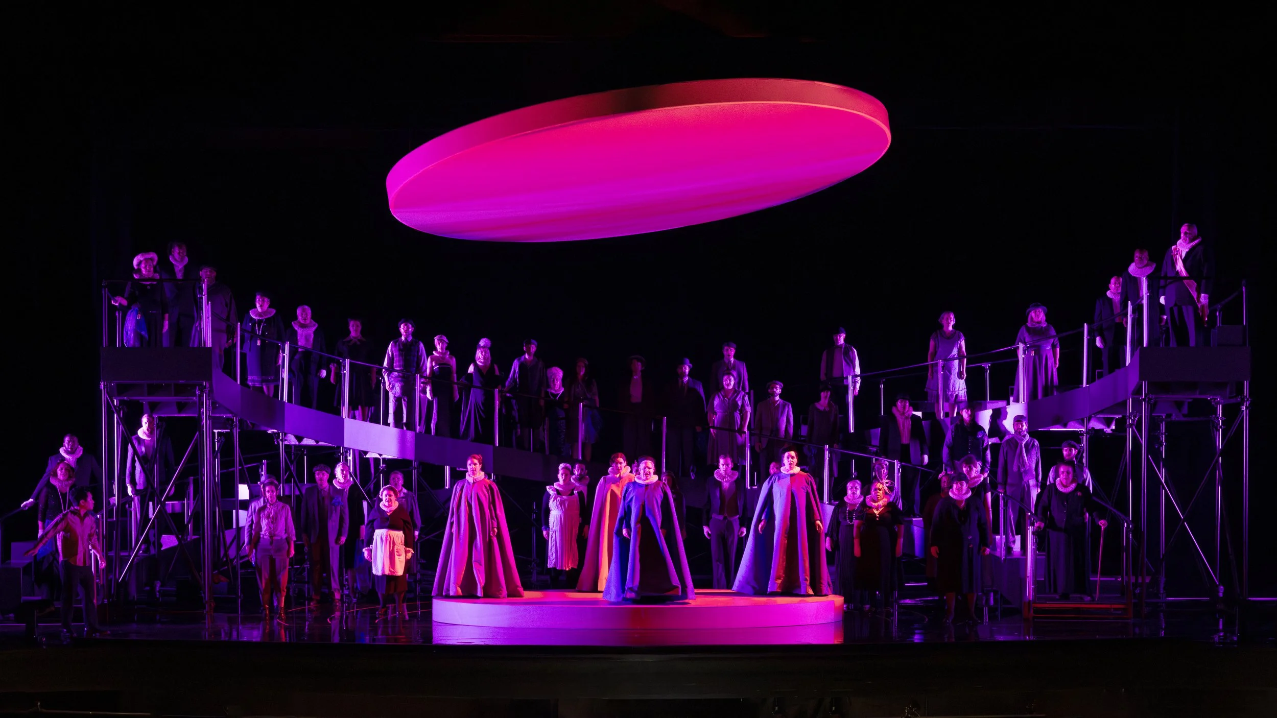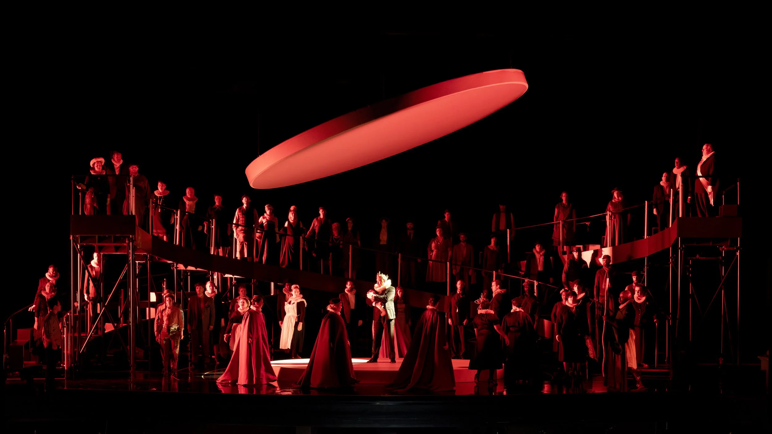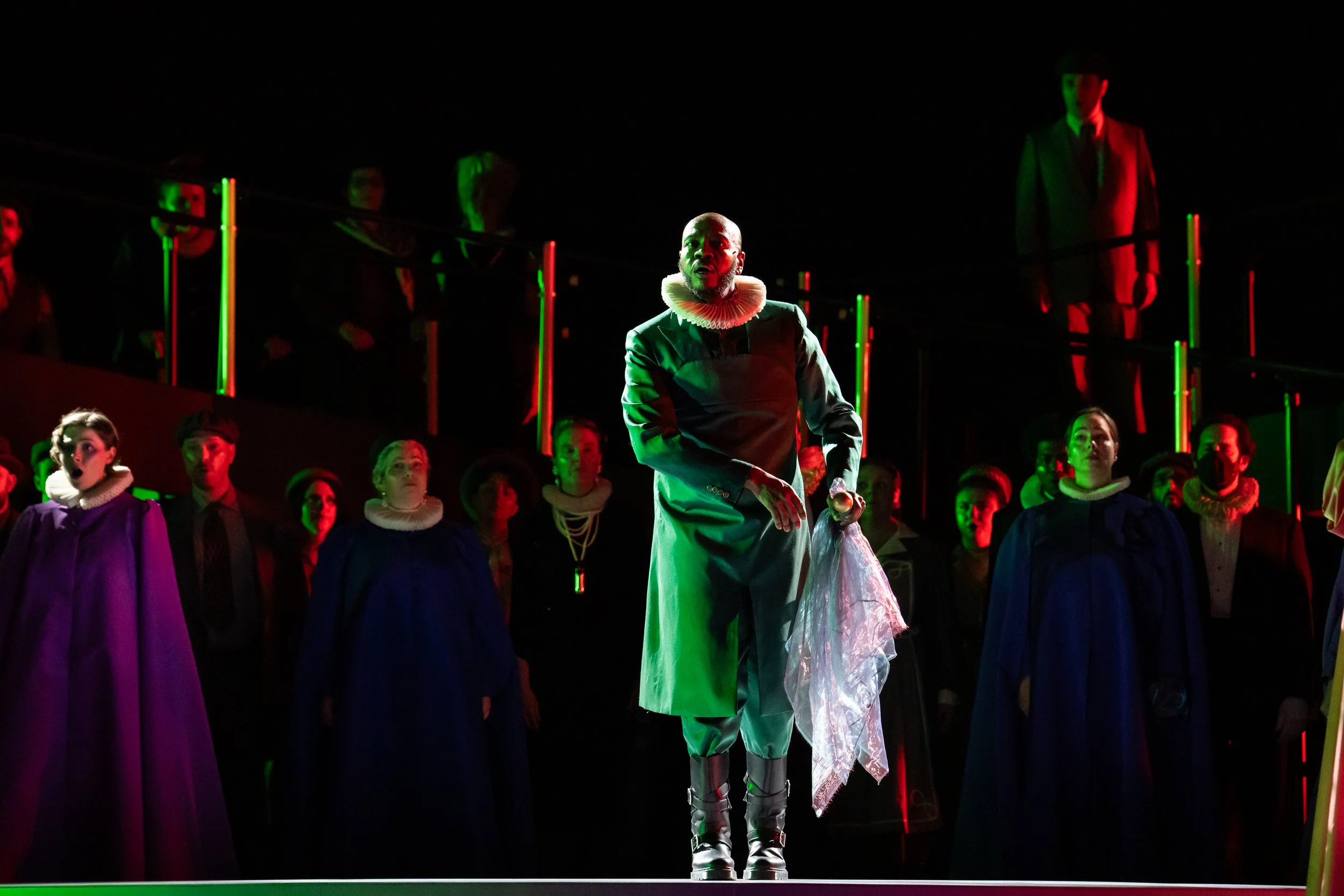 Francesca Zambello’s swift-moving staging was effective at maintaining the tension throughout. The austere set by Neil Patel with lighting enhancements by Jason Lynch and original lighting designer Mark McCullough, worked effectively in supporting the moods, and with small set changes for the forest scene and the courtroom, the stage was sufficient to showcase the drama. Period costumes by Jessica Jahn were perfect.